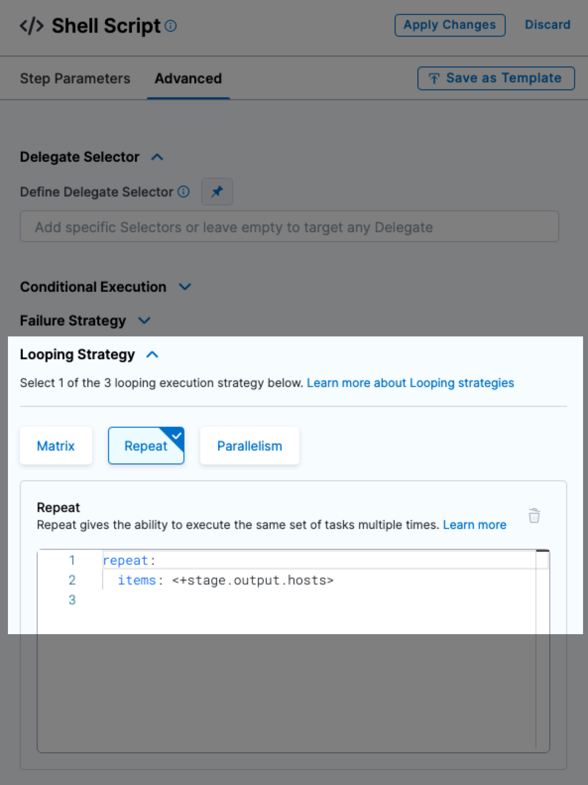 The Repeat looping strategy allows you to repeat the step for all target hosts. The strategy will iterate through the list of hosts. The list of hosts is identified with the expression <+stage.output.hosts>.