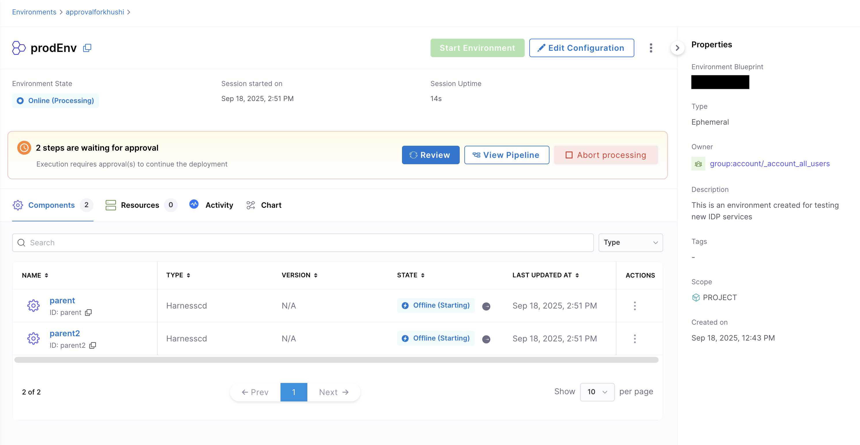 Environment management in Harness IDP enables integration with Harness Pipeline Approvals. This feature allows you to add approvers in the CD service pipeline and control the environment creation process through pipeline approvals and rejections.