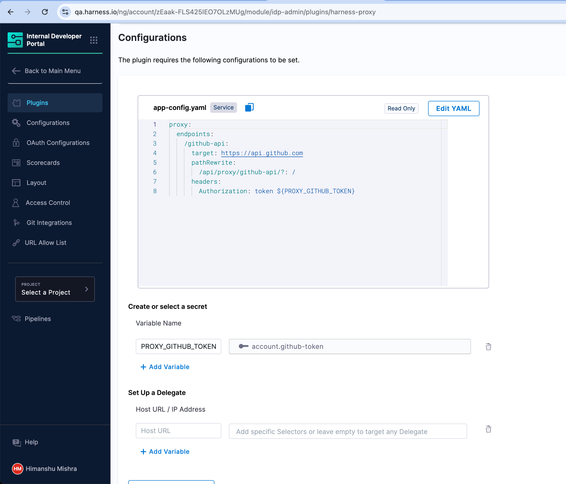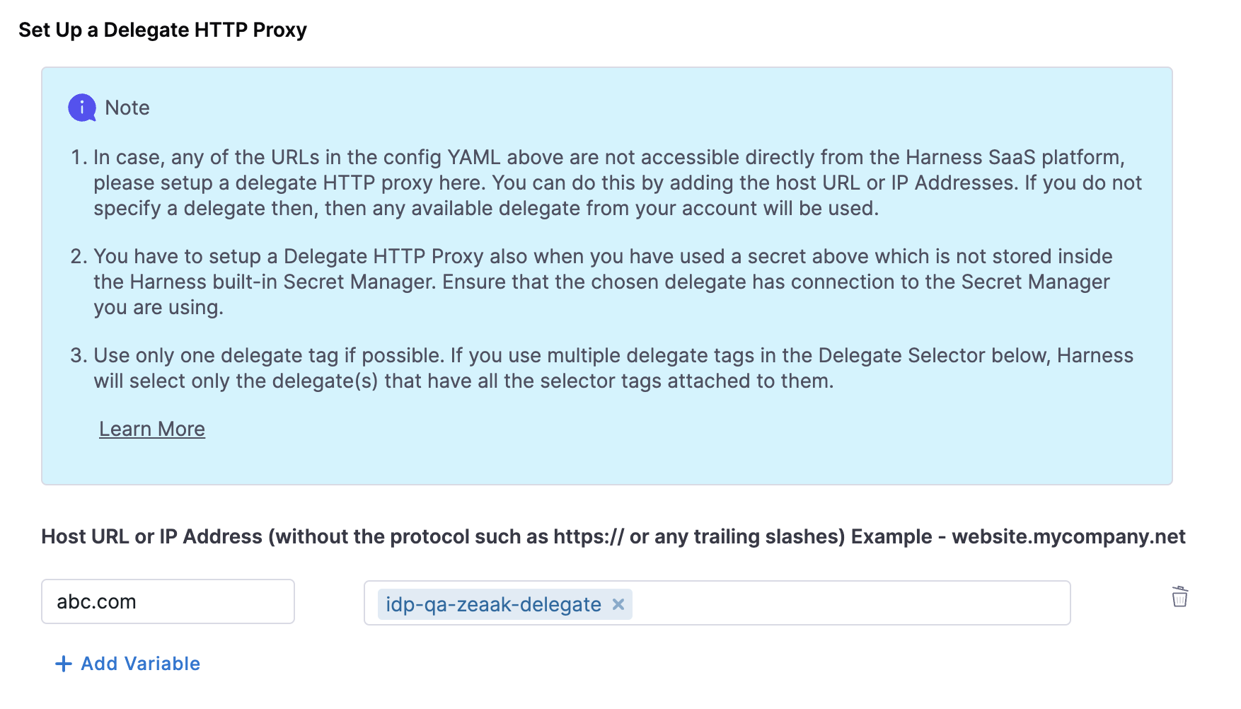 - Configure Delegate Proxy (Delegate HTTP Proxy) (in case the API is not publicly accessible, or the secret is on your infrastructure)