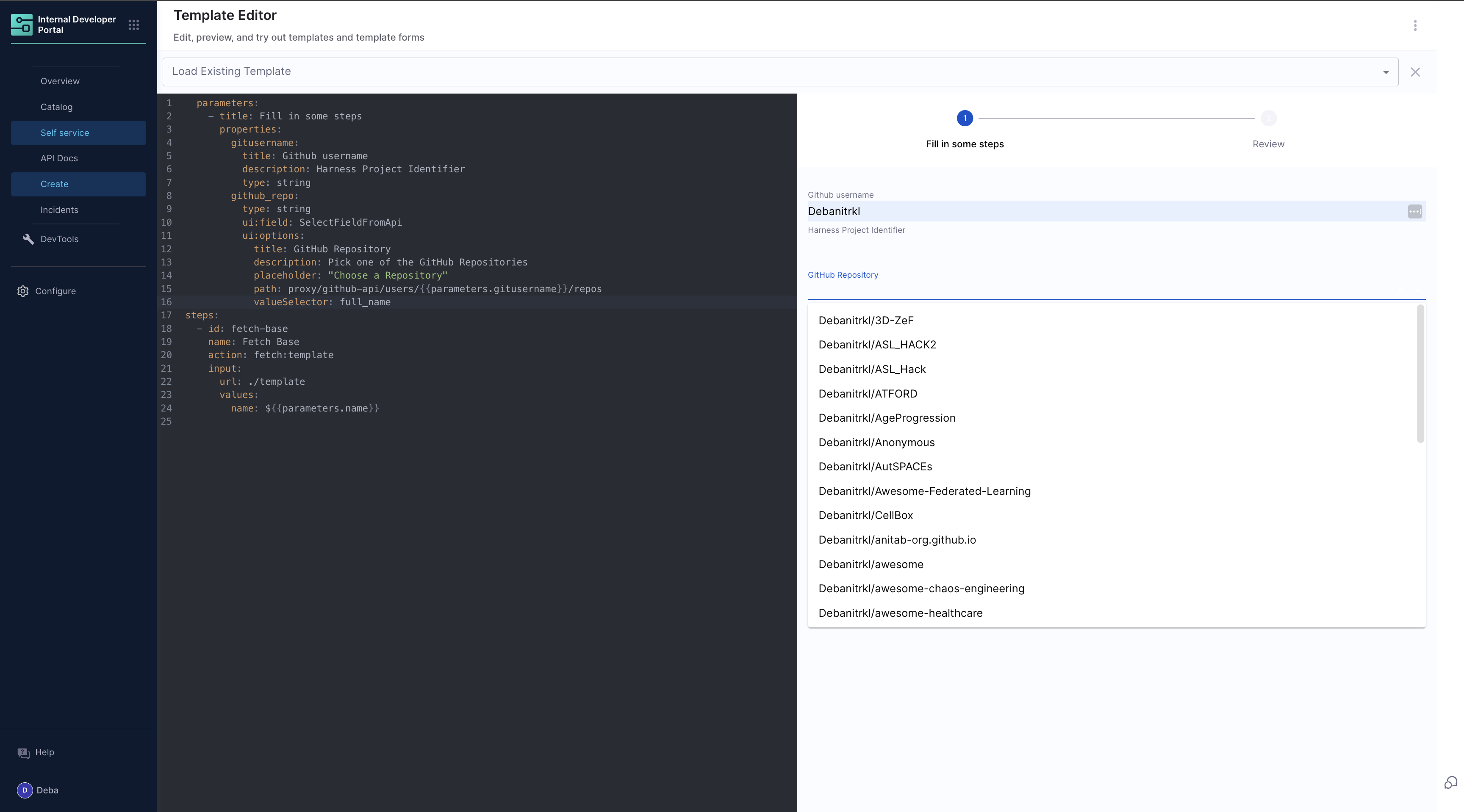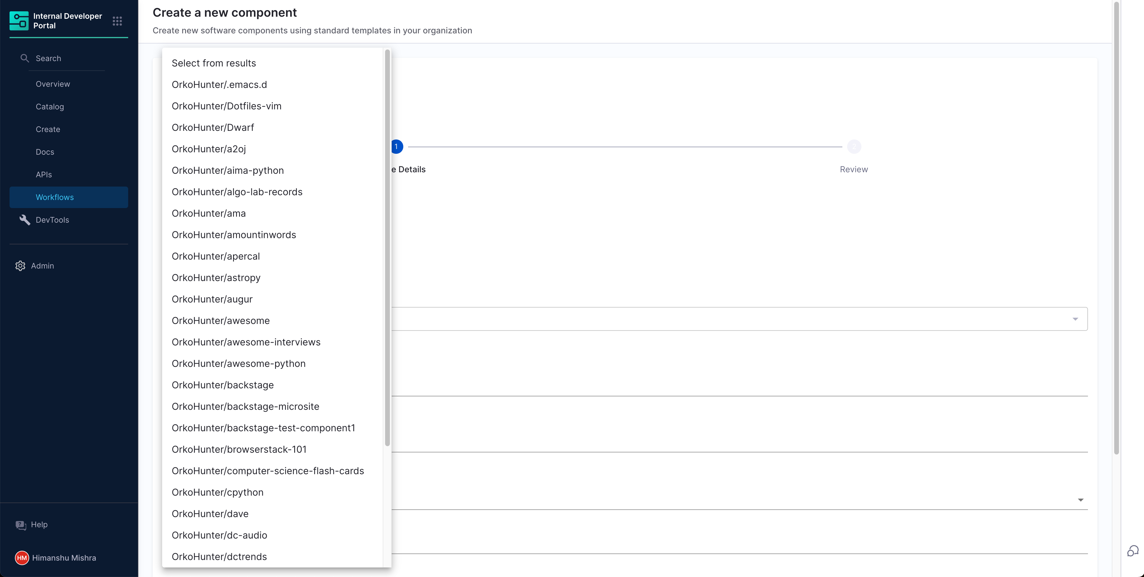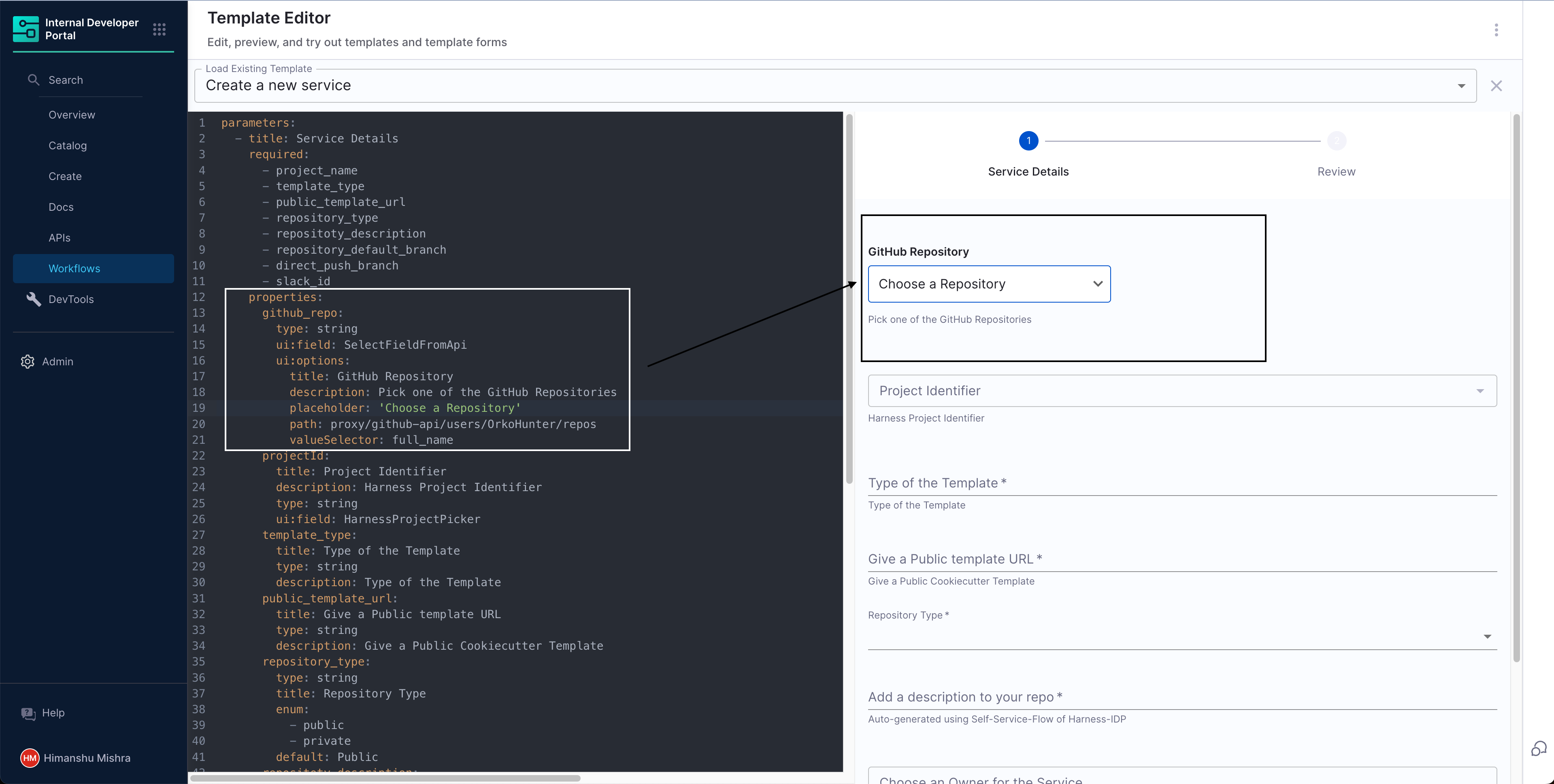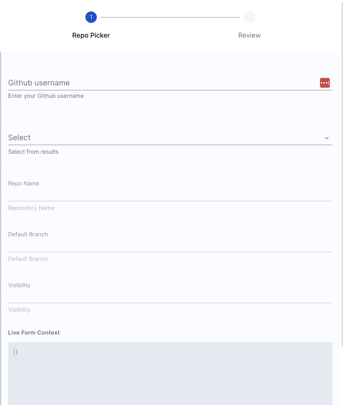 For example, consider a GitHub repository picker in a Harness IDP workflow. The repository picker consists of: