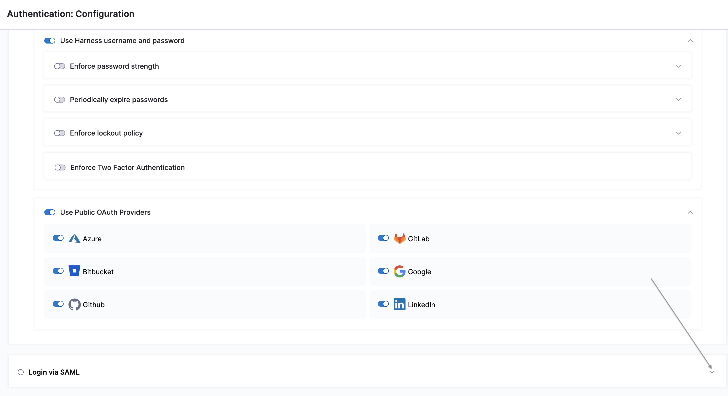 1. To enable the SSO provider, select Login via SAML.