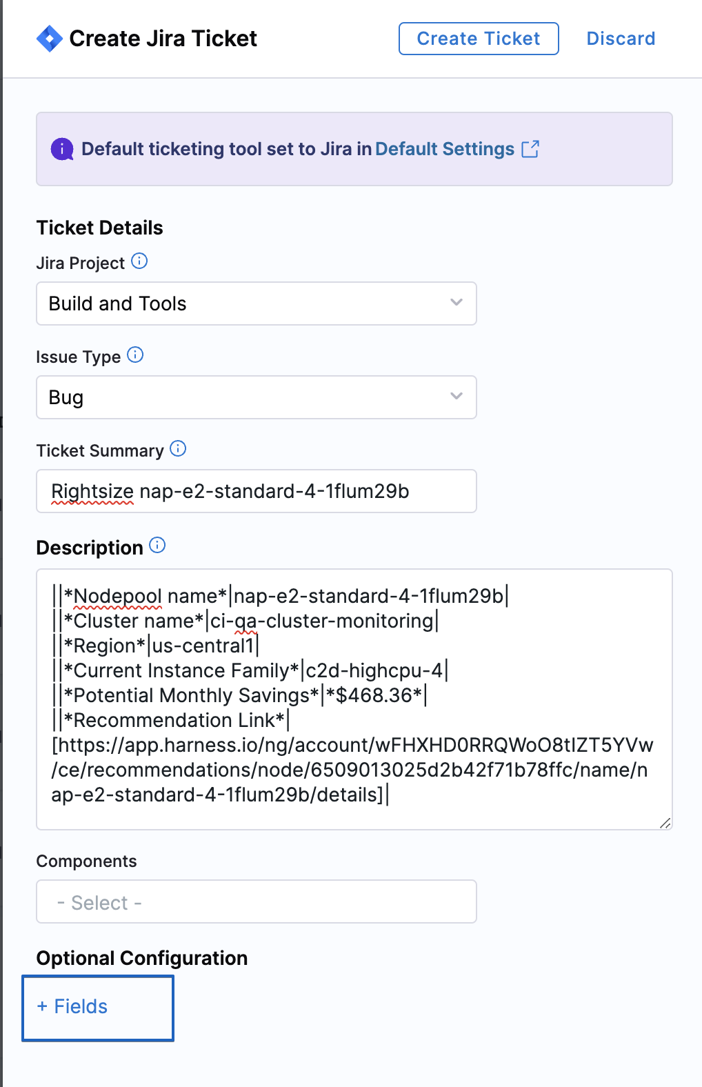 Default Project Mapping: Route recommendations to the right teams by mapping cost categories to specific Jira projects. When creating tickets, projects are auto-selected based on the resource's cost category, ensuring recommendations reach the appropriate stakeholders without manual routing.